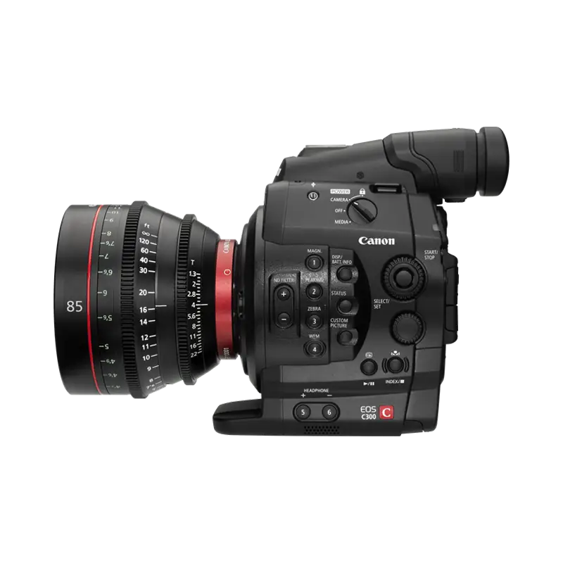 The EOS C300 features an EF mount for compatibility not only with Canon’s existing broad range of DSLR lenses, but also with the burgeoning line of EF Cinema Zoom and Prime lenses. These lenses are designed to match up perfectly with the 3-perf Super 35mm-size CMOS sensor that Canon developed for this camera. Like the camcorder, these lenses (sold separately) were developed specifically for digital cinema, with engraved markings on angled surfaces in meters and feet and uniform front diameters for easy lens switching without having to reconfigure a matte box or follow focus gearing.
